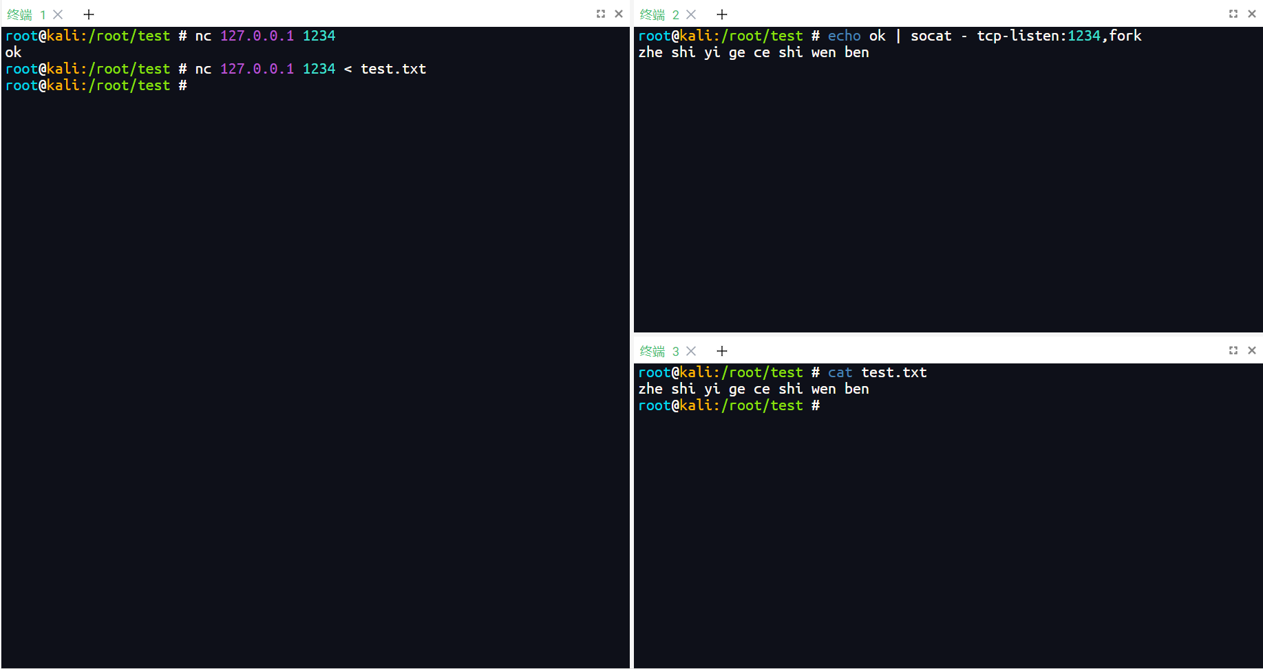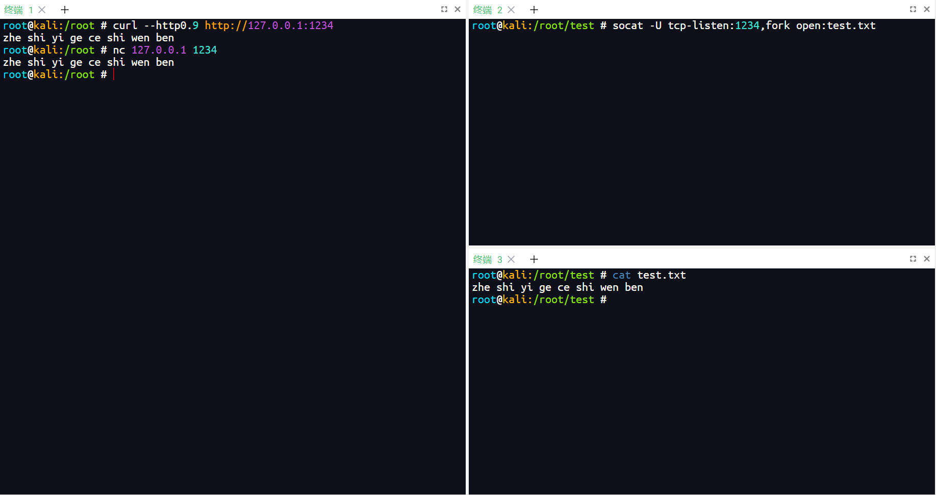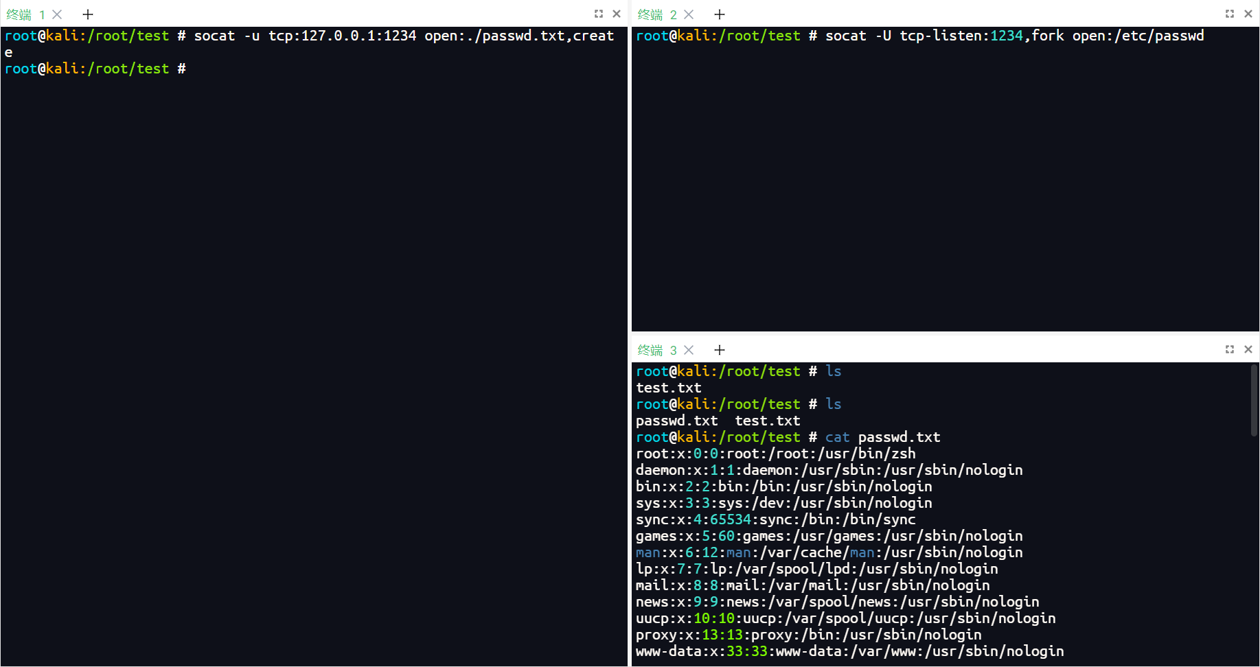 socat -u tcp:127.0.0.1:1234 open:./passwd.txt,create #TCP OPEN 接收端