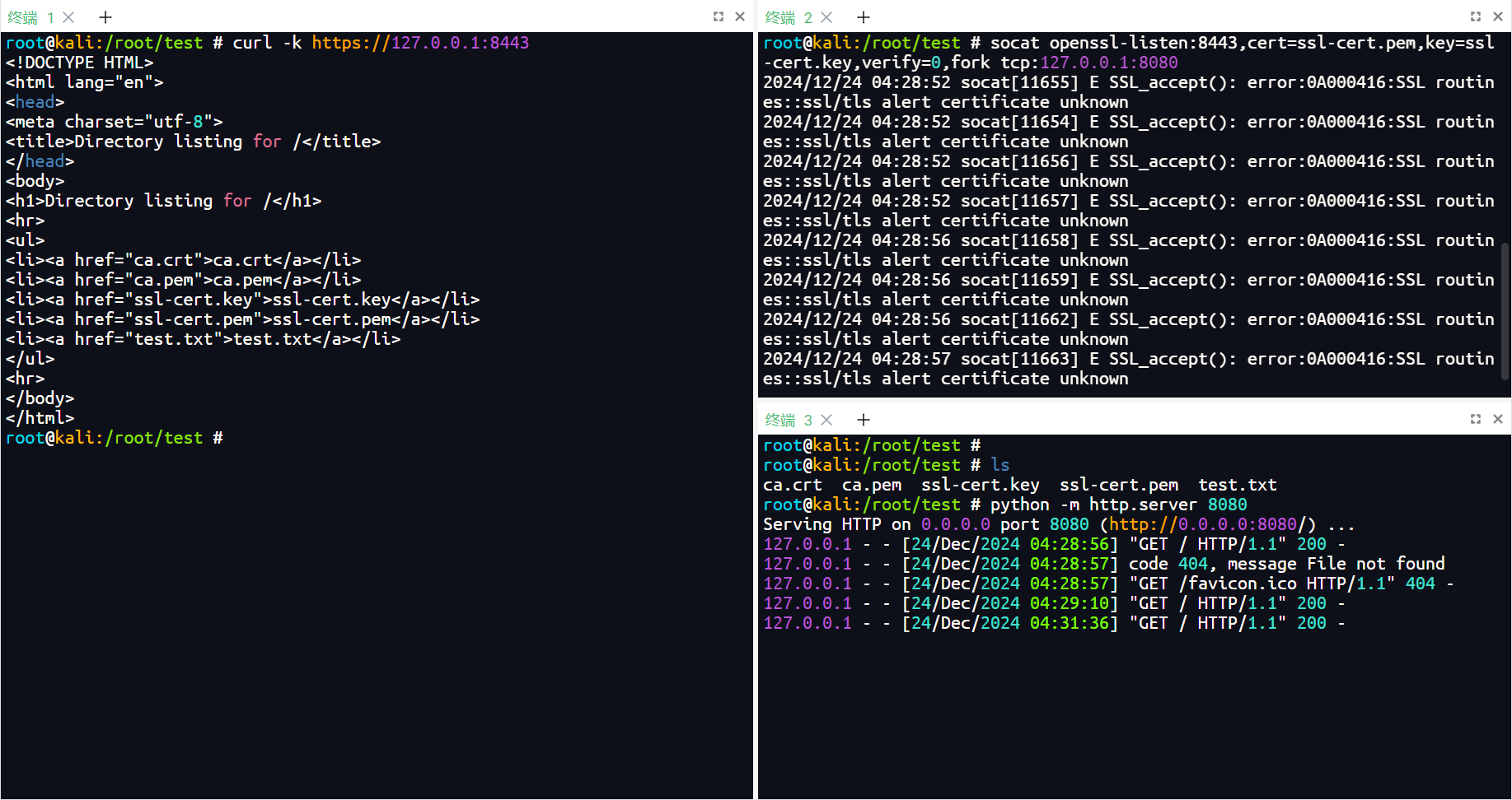 #socat - openssl:127.0.0.1:8443,verify=0 #OPENSSL 客户端