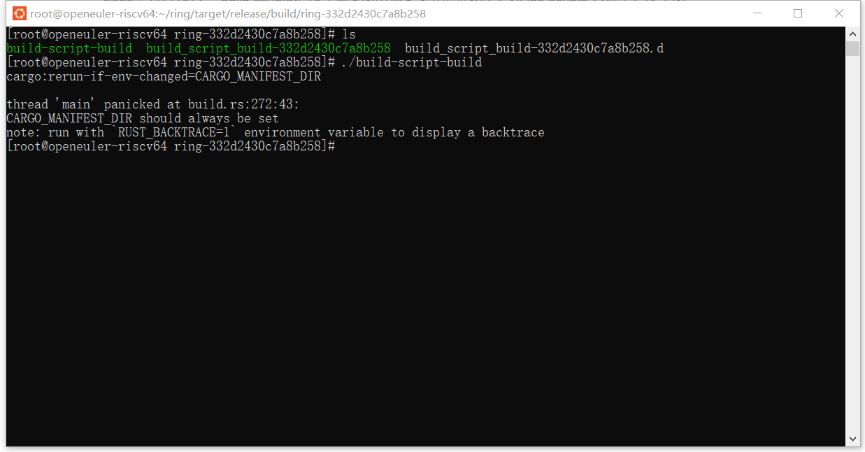 cargo build 是顺利的,不过到了这里有一个 build-script,是一个可执行文件,我尝试运行了一下,出现了似曾相识的错误。