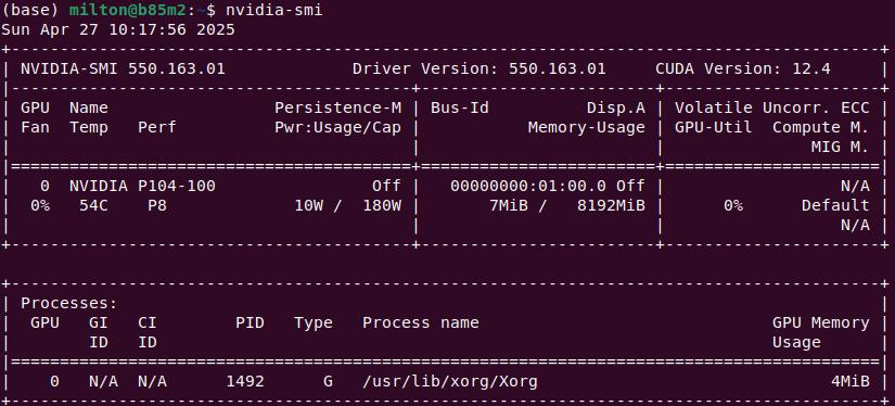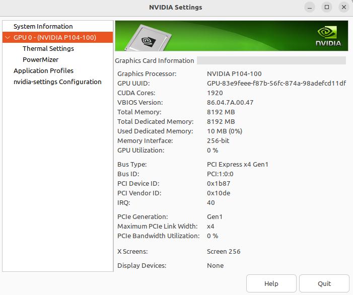 使用一块技嘉 B85m-DS3H 安装 P104-100, CPU是带集成显卡的i5-4690. 先在BiOS中设置好显示设备优先使用集成显卡(IGX). 然后安装P104-100开机. 登入Ubuntu 后查看硬件信息, 检查P104-100是否已经被检测到