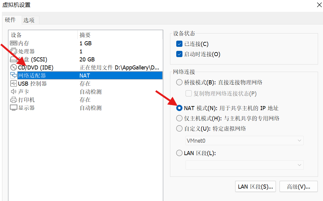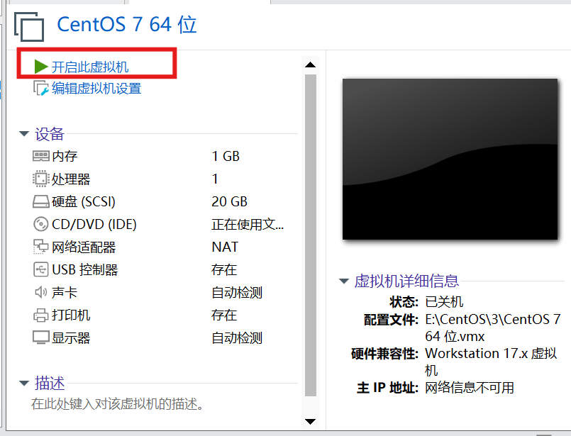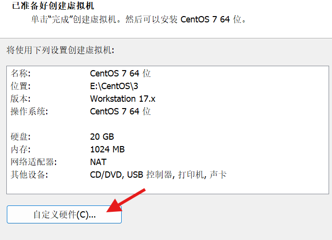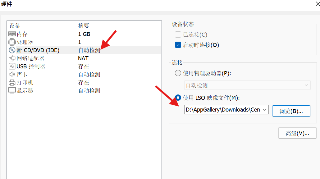 点击“新CD/DVD”,“使用ISO映像文件”,设置CentOS7的路径,点击“关闭”,“完成”