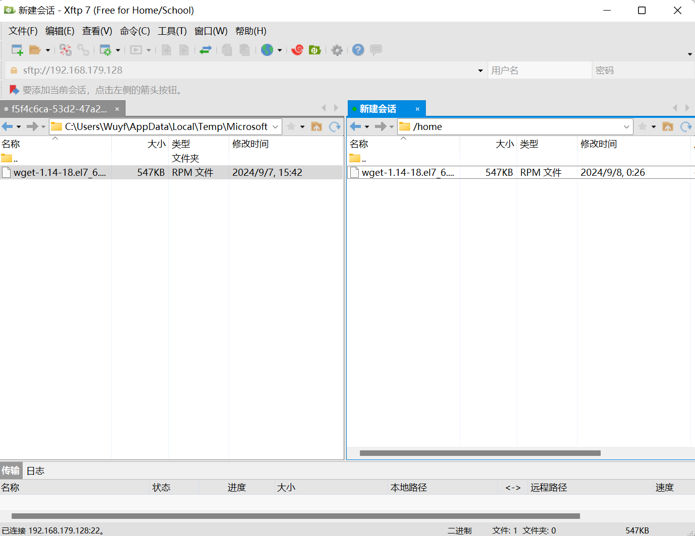 ,直接用鼠标把 wget 拖拉到右侧,这样就传输过去了