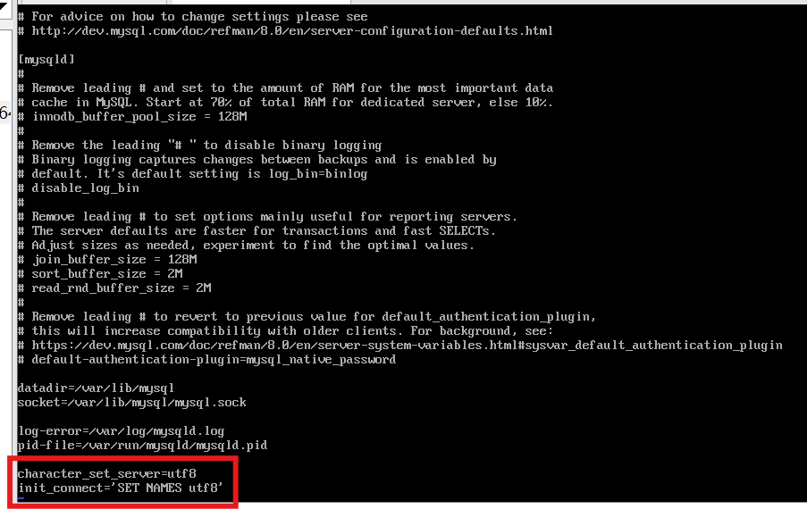 在文件最后加2行内容后保存,character_set_server=utf8,init_connect='SET NAMES utf8'