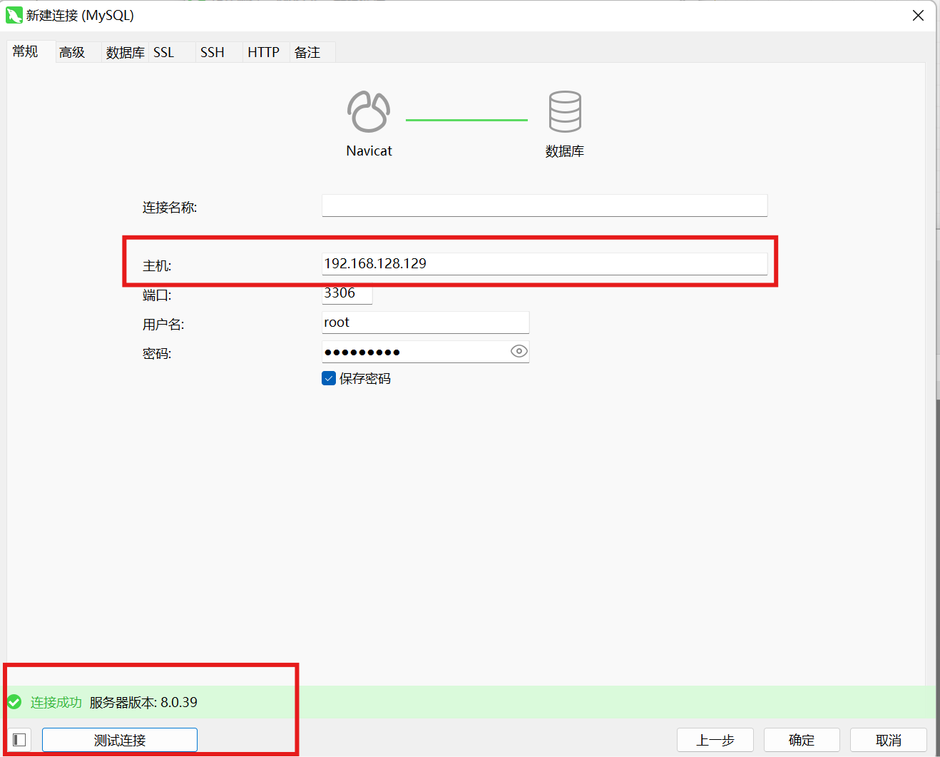 打开Navicat,新建连接,主机填入虚拟机被分配的IP