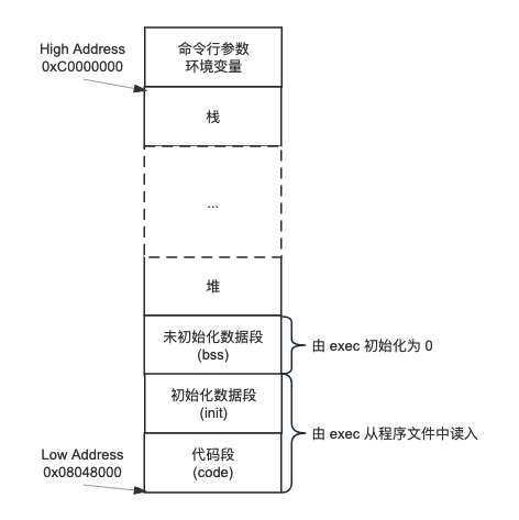 命令行参数与环境变量是放在进程高地址空间的末尾,以 \0 为间隔的字符串。由于有高地址“天花板”在存在,这里必需先计算出所有字符串的长度,定位到起始位置,再复制整个字符串,此外为了保证 argv[0] 地址小于 argv[1],整个数组也需要从后向前遍历。这里借用之前写的一个例子证明这一点: