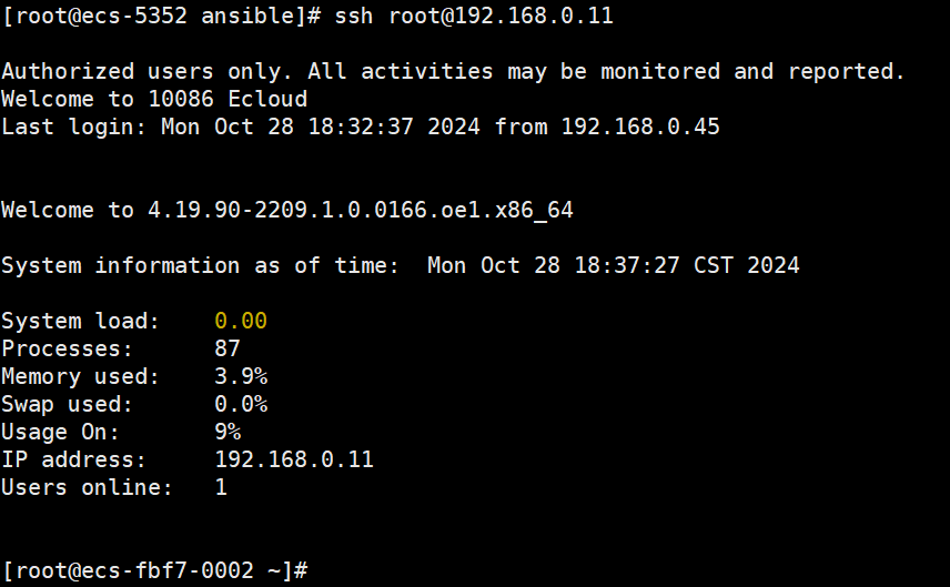 直接在ansible主机上,使用ssh命令测试是否可以免密登录