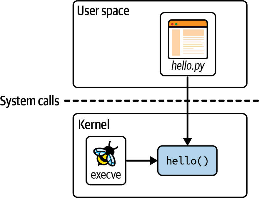 下图展示了这段代码。Python 程序编译 C 代码,将其加载到内核,并将其连接到 execve_syscall_kprobe。只要该(虚拟)机器上的任何应用程序调用 execve(),就会触发 eBPF hello() 程序,该程序会将一行跟踪记录写入特定的伪文件。(Python 程序会从伪文件中读取跟踪信息并显示给用户。