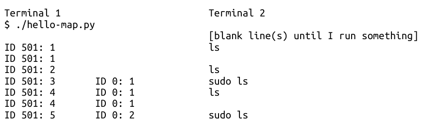 在第二个终端中,我的用户 ID 为 1084。使用此用户 ID 运行 ls 命令会增加 execve 计数器。当我运行 sudo ls 时,这会导致两次 execve 调用:一次是 sudo 的执行,用户 ID 为 501;另一次是 ls 的执行,用户 ID 为 root 的 0。