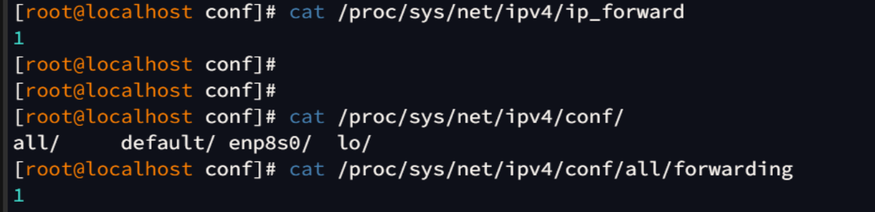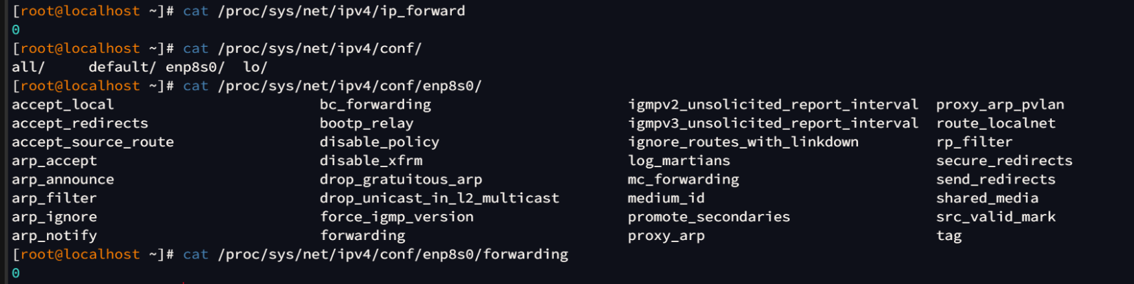 2)实际真正控制网卡启用 ip 转发的,是网卡对应的 forwarding 参数:/proc/sys/net/ipv4/conf/enp8s0/forwarding