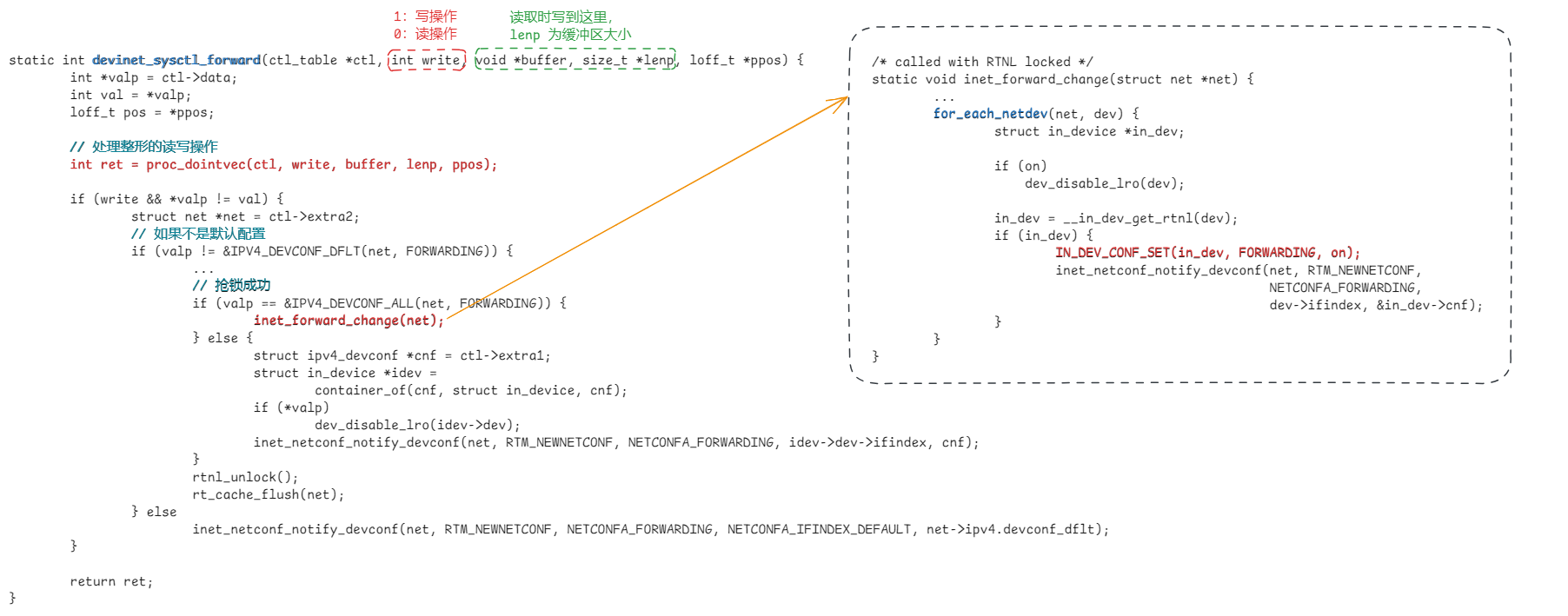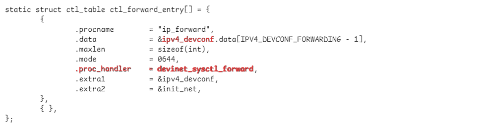 的位置;644 代表root可读写,其他只读;最后,为这个参数文件绑定了一个读写回调函数 devinet_sysctl_forward