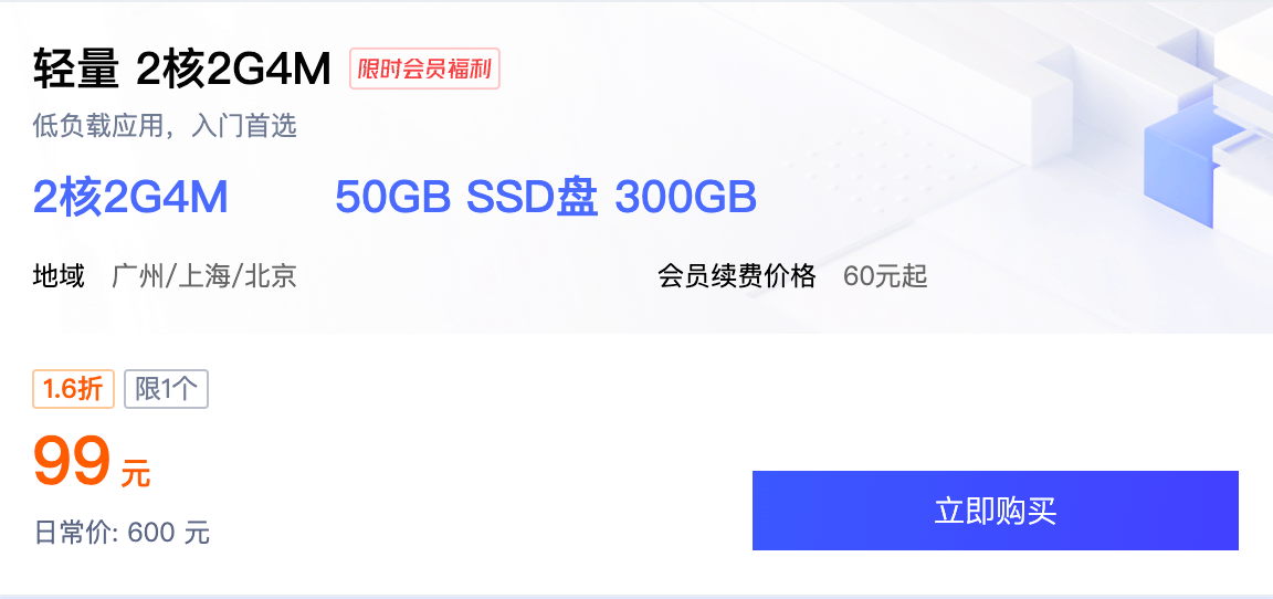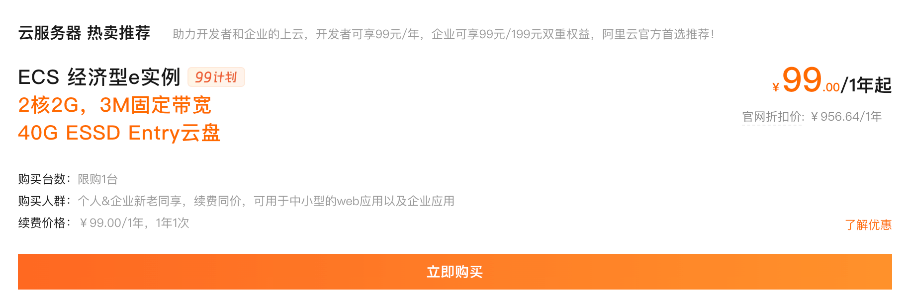 阿里云新用户购买折扣比较大,云服务器2核2G 3M固定带宽原价 1507.56/年, 现低至 99元/年,另外可以按 99元 续费一年,也就是 198元 用两年点击下面图片查看详情。
