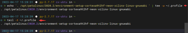 echo '. /opt/petalinux/2020.2/environment-setup-cortexa9t2hf-neon-xilinx-linux-gnueabi ' | tee -a ~/.profile #注意看下图,这条命令是完整的一行