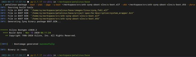 切换到创建的Petalinux工程目录,执行下面的命令制作领航者开发板所需的启动文件BOOT.BIN: