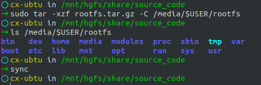 将rootfs.tar.gz拷贝到Ubuntu系统中,然后使用tar命令将rootfs.tar.gz压缩包文件解压到SD启动卡的第二个分区,如下所示: