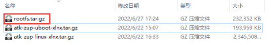 接下来我们要拷贝根文件系统到SD启动卡第二个分区,在开发板资料包中已经给大家提供了出厂时使用的根文件系统,在开发板资料盘(A盘)\4_SourceCode\3_Embedded_Linux\资源文件\出厂镜像相关目录下有一个名为rootfs.tar.gz的压缩包文件,如下所示: