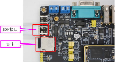 sync同步完成之后,卸载SD卡(umount命令),拔掉SD卡将其插入开发板SD卡卡槽,将开发板启动方式设置为SD卡启动,连接串口、LCD屏和电源启动开发板,领航者开发板连接SD(TF)卡的正面图如下图所示: