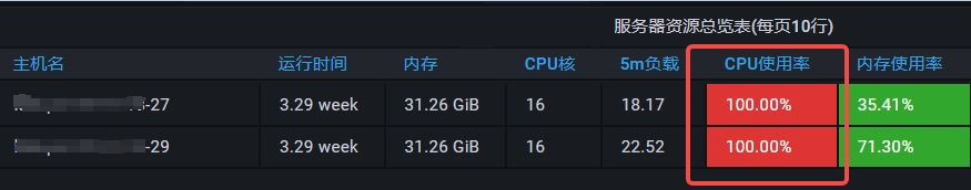 在查看监控系统时,发现该服务器节点CPU 利用率达到了100%,难怪程序已经无法运行。并且,还发现有这种情况的节点不止一个,整个环境中有好几台服务器都是CPU 100%的情况