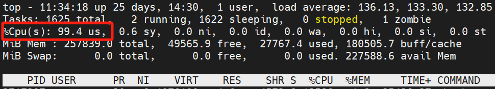 使用Top命令查看进程 ,可以看到CPU的使用率已经跑满。但在进程列表中却未发现有异常进程 。除有个别业务程序占用CPU较多,但关掉后情况并未改善。