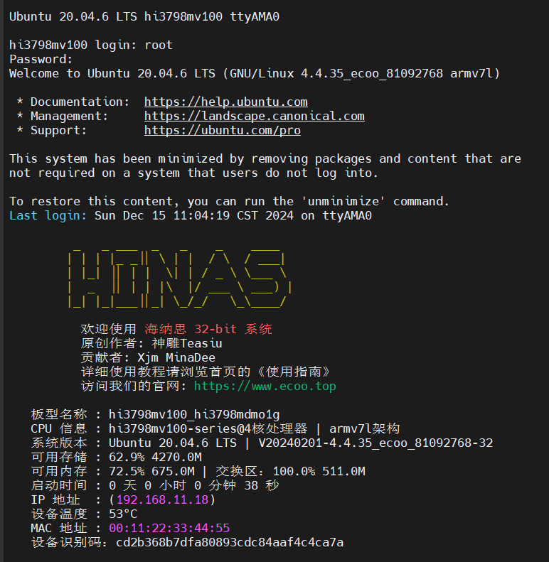 刷机完成后重启盒子,使用串口或者SSH登录到设备,用户/密码:root/ecoo1234。然后进入欢迎页面