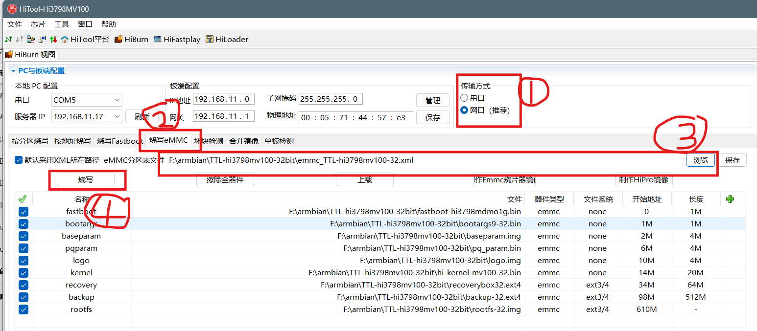 依次进行:1、传输方式选择网口,2、选择eMMC烧写 3、点击浏览,在打开的窗口中选择解压后刷机包中的emmc_TTL-hi3798mv100-32.xml文件,然后需要刷写的文件会在下面依次列出,4、点击烧写,然后根据软件左下角控制台的提示信息重启盒子,然后开始刷机过程。