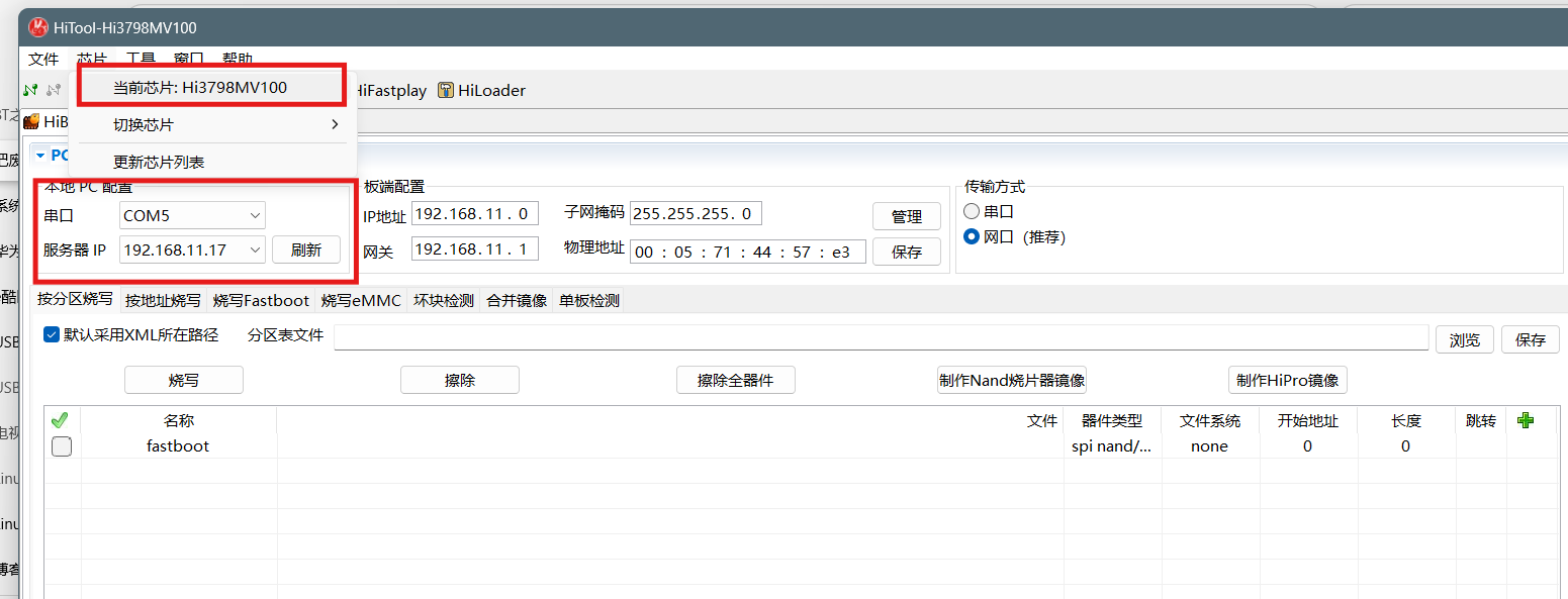 连接串口并给盒子上电,将盒子用网线连接路由器,解压下载的TTL-hi3798mv100-32bit.zip刷机包,打开HiTool软件,点击左上角“芯片”菜单,确认当前芯片型号与盒子的芯片型号一致,然后在本地配置中选择连接到电脑的串口号,点击一下刷新,然后在服务器IP的下拉菜单中选择与本地局域网IP地址段相同的那个IP,其他项保持默认。