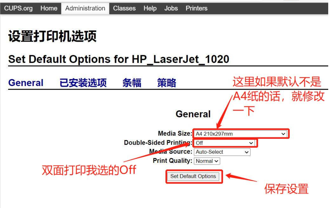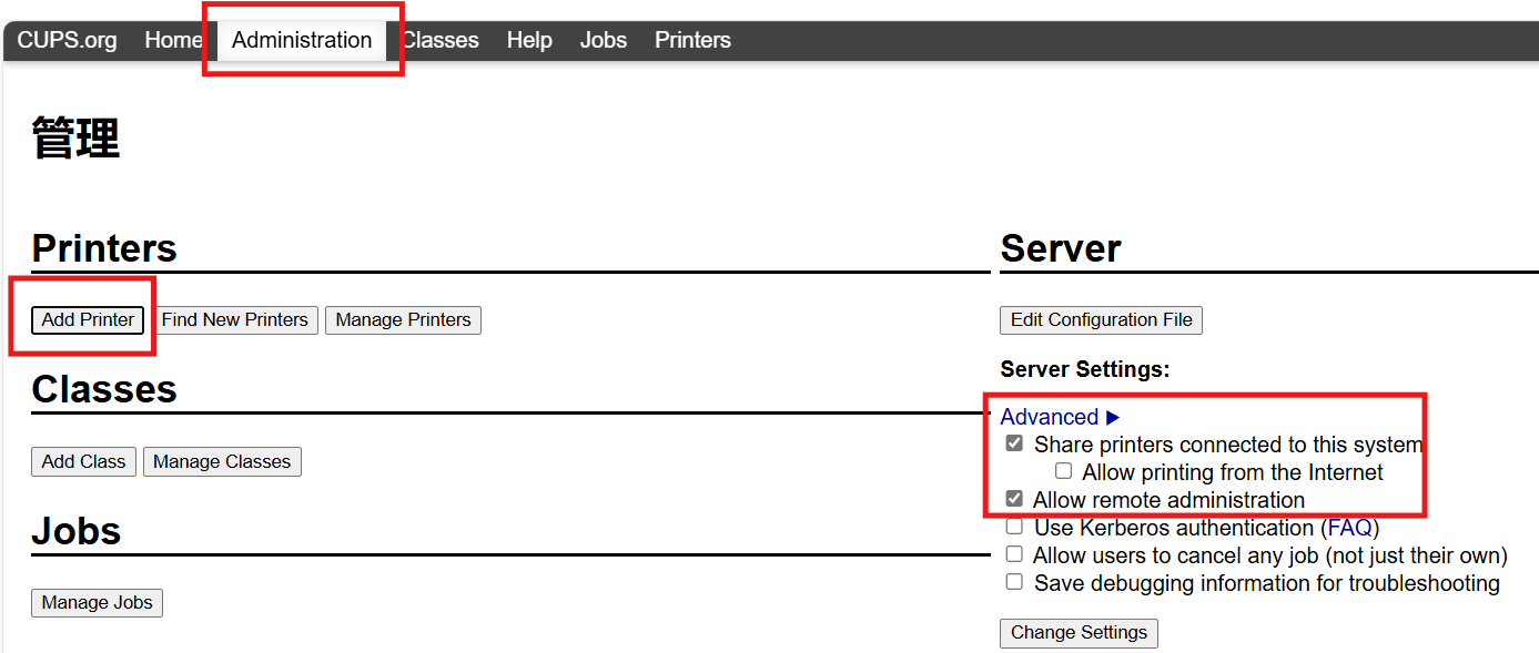 然后电脑访问:https://盒子ip地址:631 进入cups配置页面,选择Administration页面,选中右侧的两个选项以便手机能够搜索到打印机,然后点击Add Printer开始添加打印机,再次点击”Add Printer“按钮,会要求填入服务器的用户名和密码,填好以后点确定进入下一步。