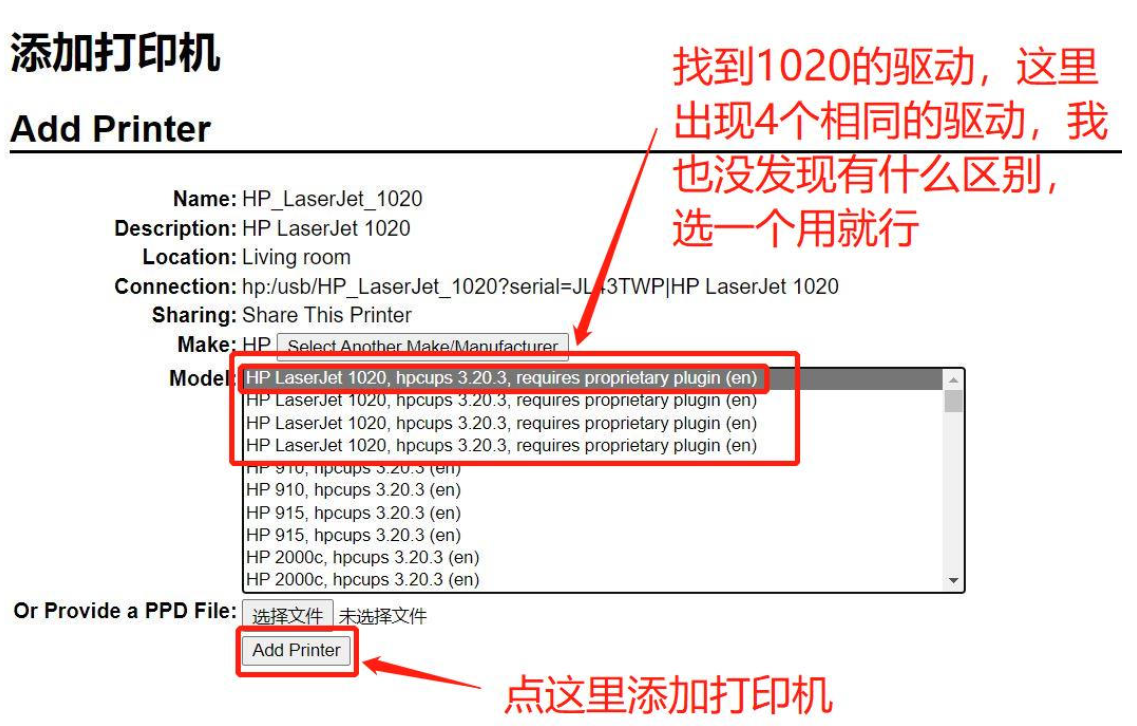 这一步选择打印驱动程序,也就是刚才通过hplip命令安装的打印机驱动陈鼓型。最后点添加打印机按钮。完成打印机的添加。