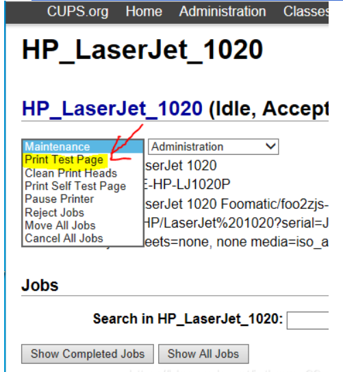 点击打印机名称后,进入打印机详情页,第一个复选框里选择”Print Test Page“可以打印测试页,测试打印机是否正常。