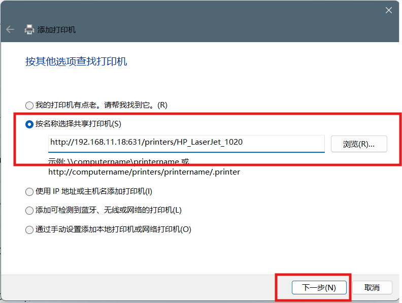 在弹出页面中选择按名称选择共享打印机,将cups的打印机配置页面的网址复制过来,将https改为http填到下面去, 点击下一步。