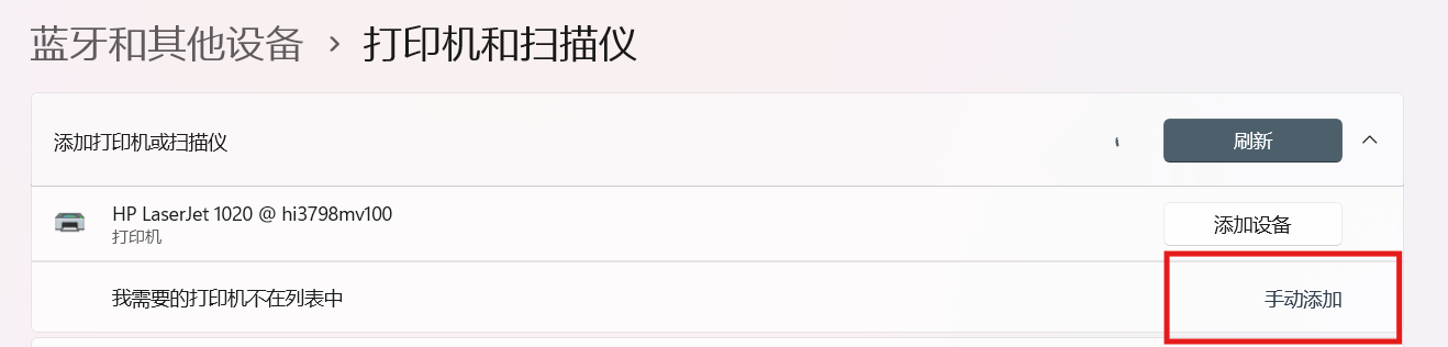 在电脑的设置-》打印机页面,点击添加打印机,然后点击手动添加。
