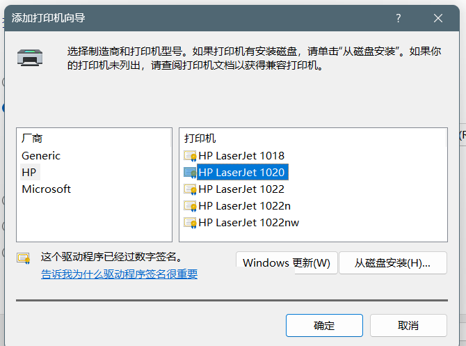 弹出的页面中,先选择厂商:HP,然后打印机选择1020,最后点击确定。完成电脑端的打印机添加。