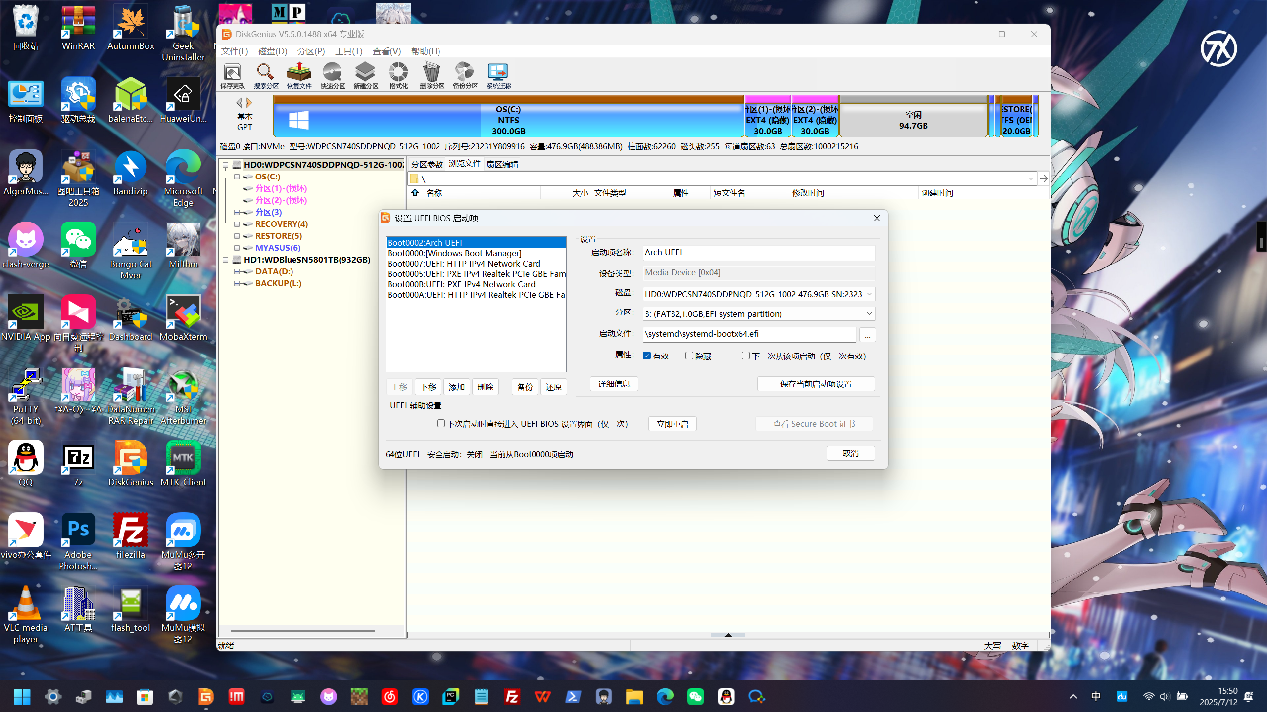 总之,需要自己在Windows里的Diskgenius里,或者UEFI BiOS里,把Arch Linux的EFI文件添加到启动项中。