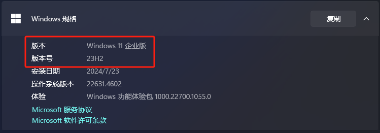 或者是在"设置—>系统—>系统信息—>Windows规格"中查看我们的系统版本号,只有运行 Windows 10 版本 2004 及更高版本(内部版本 19041 及更高版本)或 Windows 11才能使用WSL2