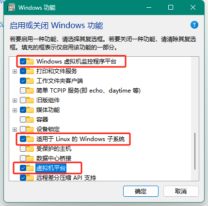 在确认无误系统支持WSL2后我们进入"控制面板—>程序—>启用或关闭Windows功能"中勾选打开如下四个功能,点击确认后系统会需要大家重启电脑来启用这些功能