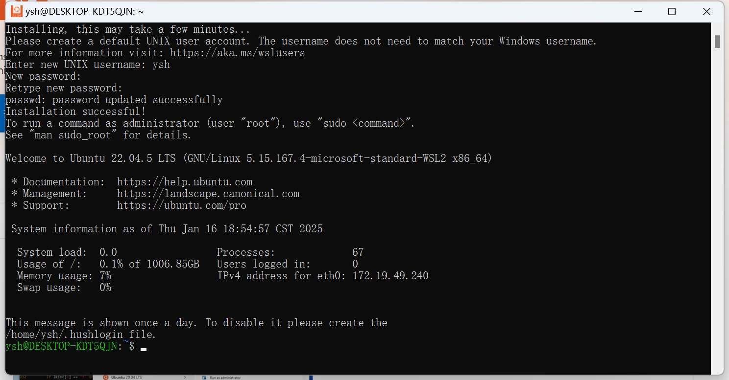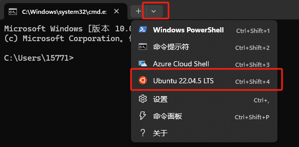 在上方的下拉箭头便会有对应的Ubuntu22.04选项,于是我们这时候可以点击这个选项便可以进入系统配置界面,或者是直接输入wsl