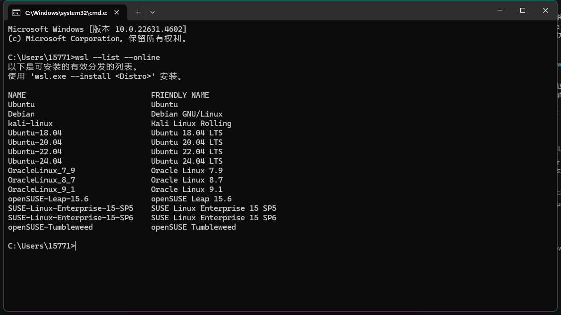 然后我们用Ubuntu22.04来演示如何安装自己需要的Linux的系统,其他的系统版本步骤类似,在WSL中安装Ubuntu和安装虚拟机其实是类似的,我们都需要一个系统镜像来进行安装,这个镜像目前只能从微软官方获取,如果你的电脑启用了代理,那么你可以直接在cmd中输入以下命令来获取可用版本的 Linux 发行版列表,并使用如下命令进行安装