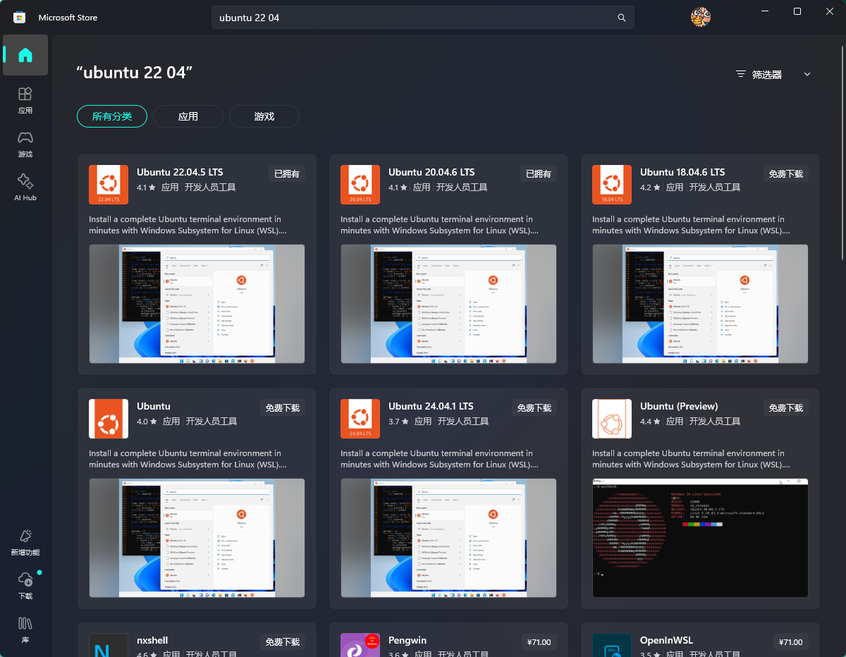 后点击即可打开微软商店,在搜索框输入Ubuntu即可显示Linux系统分发,PS:如果你开着代理,大概率微软商店将无法正常加载内容