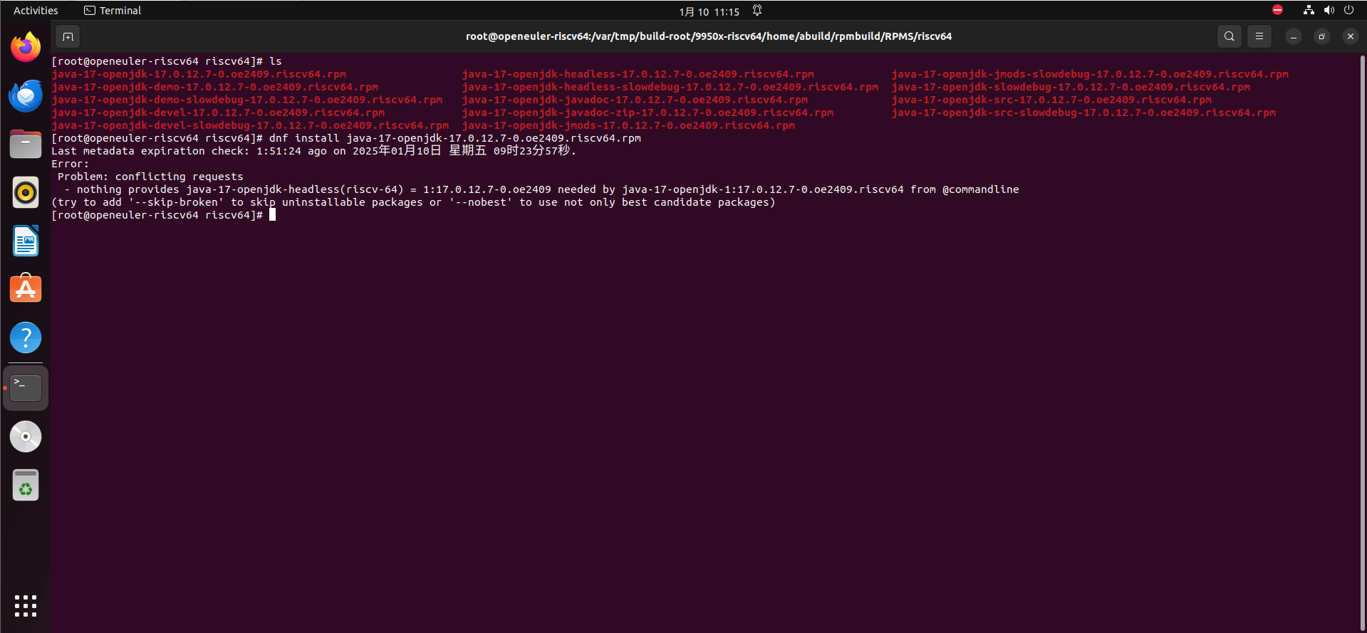 正常来说,dnf下载包是通过这些repo来下载的,而下载普通的包,不含源码和调试信息的话,是从everything仓获取的。网站在这里:repo.openeuler.org/openEuler-24.09/everything/riscv64/Packages/。在这个网站中,确实没有找到java-17-openjdk和HMCL的有关信息,所以大抵可以解释上面的问题。我之前也一直有一个误区,就是以为obs上面打包好的,都可以通过dnf直接下载,看来是误区。