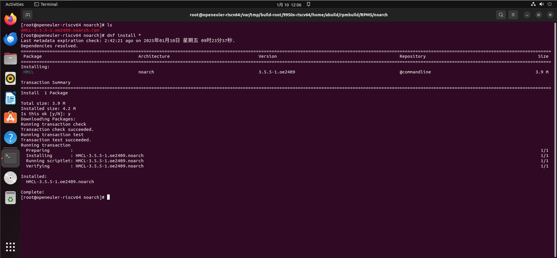 在这个网站上,可以找到HMCL已经打好的包(Show openEuler:24.09 / HMCL - 开源软件构建与测试)。按理来说,在OERV上直接dnf install HMCL是可以下载的,不过我失败了,因为找不到这个包。于是我用了osc拉到本地进行手动编译(需要对obs平台,osc命令有一定了解)。编译好了,下载HMCL的rpm包时显示缺了Java-17-openjdk的库(这里省略图片),接着应该下载Java-17-openjdk。