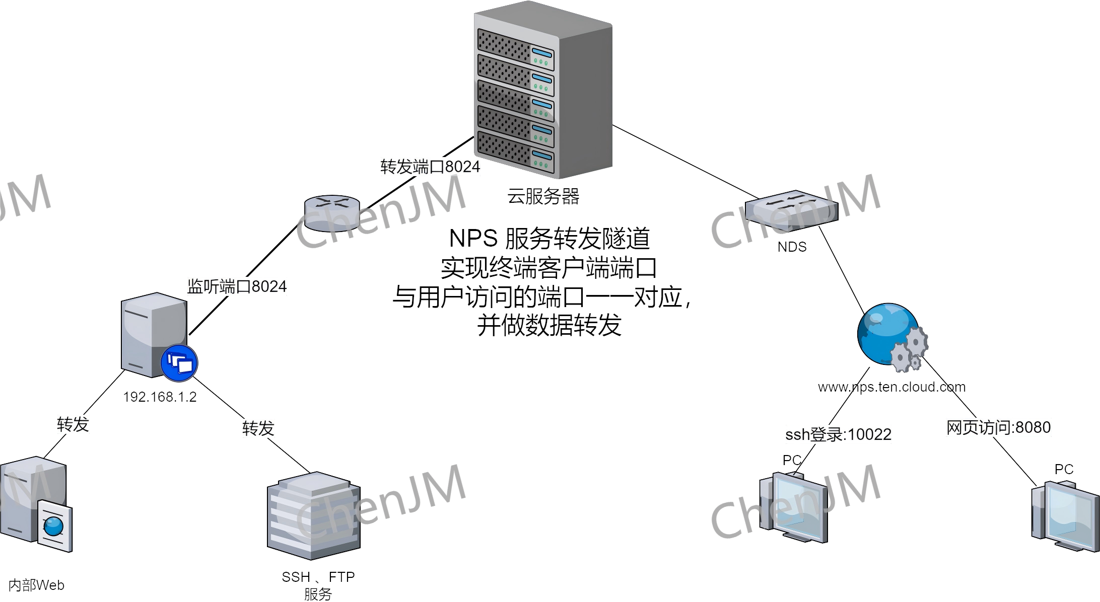 通过内网穿透云服务器,客户端远程访问的过程如下 终端的NPC客户端会监听云服务器的转发端口,如配置的8024。而云服务NPS 服务端转发隧道实现终端客户端端口,与用户PC访问的端口一一对应,并做数据转发
