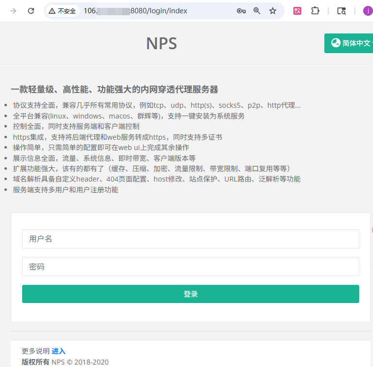 这样NPS服务器就配置好了,可以通过公网IP+端口号默认是8080登录网站,效果如下