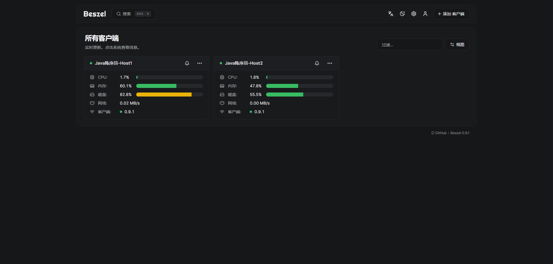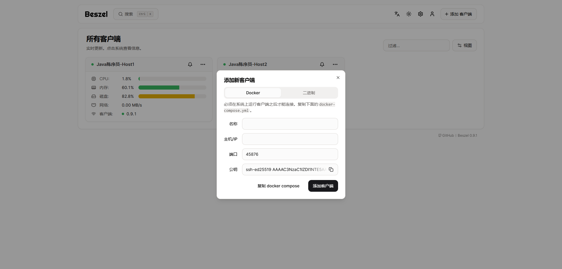 Beszel Hub 支持通过 Docker/ Podman 或单个二进制文件进行安装,这里以 Docker 安装为例。