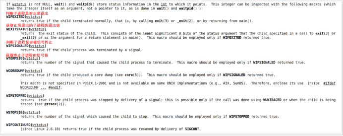 //wait函数的参数是一个指针,用于记录子进程的退出状态,如果该参数为NULL,则表示当前进程放弃子进程的退出状态。对于该指针中记录的值,可以通过系统提供的宏定义来分析子进程的退出状态。