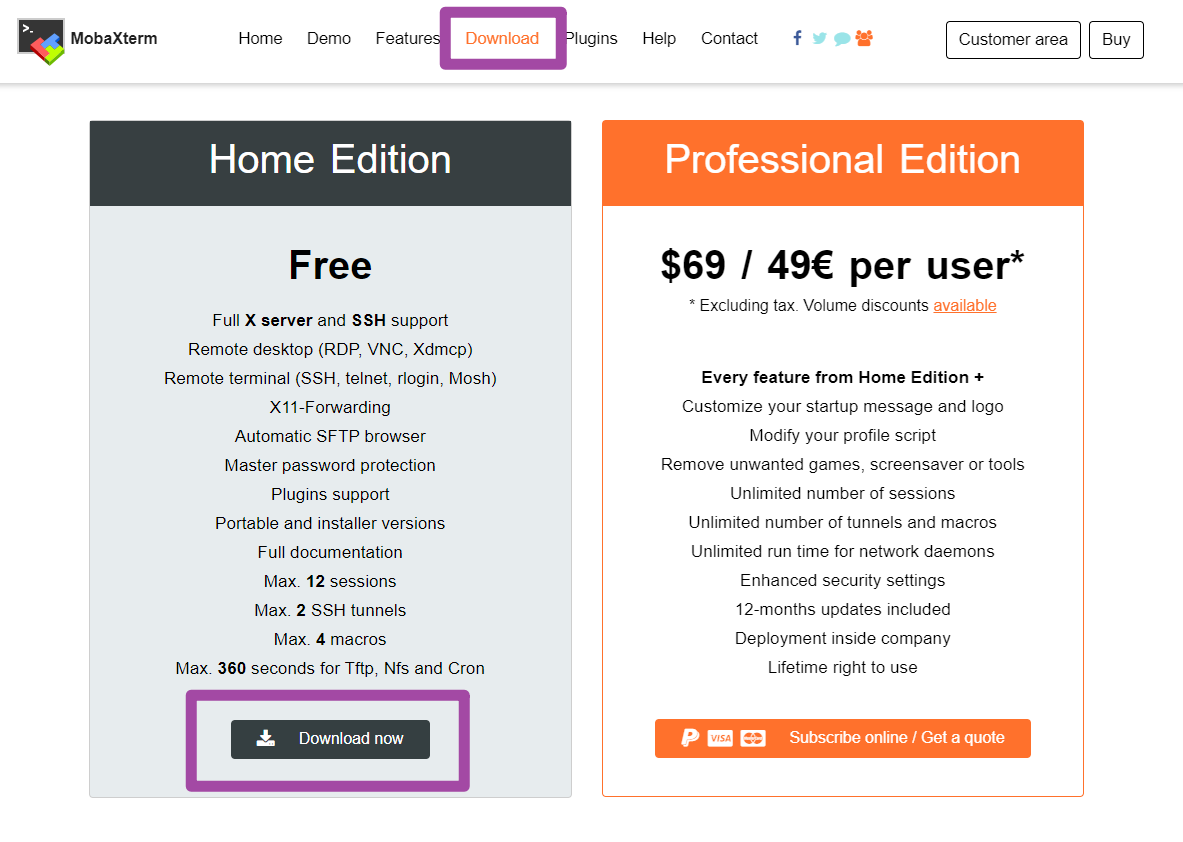 首先,我们需要进行MobaXterm软件的下载与安装。我们直接在这一软件的官方网站,来下载软件即可。如下图所示,进入网站后,选择上方的“Download”选项,然后下载左侧的“Home Edition”版本即可——这个版本是免费的,其可以满足一般情况下我们所有对于远程服务器的控制需求了。