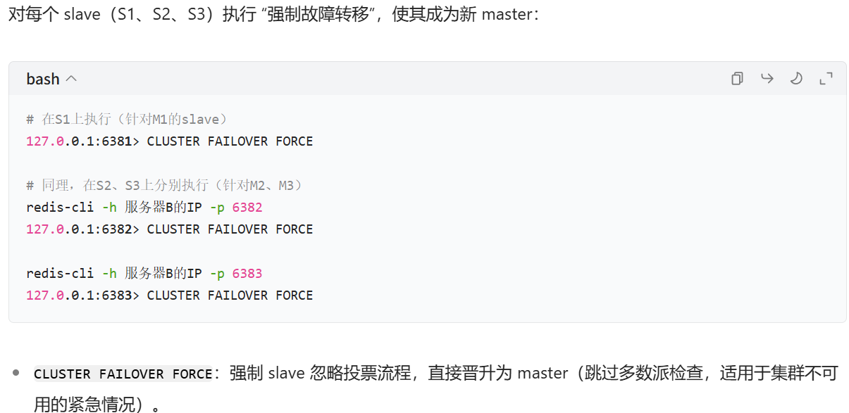 若这 3 个 master 的 slave 在其他服务器(且存活),但此时原 3 个 master 已下线,剩余的 master 数量为 0(无法满足多数派投票),集群会进入 “不可用” 状态,自动故障转移失败,必须手动干预