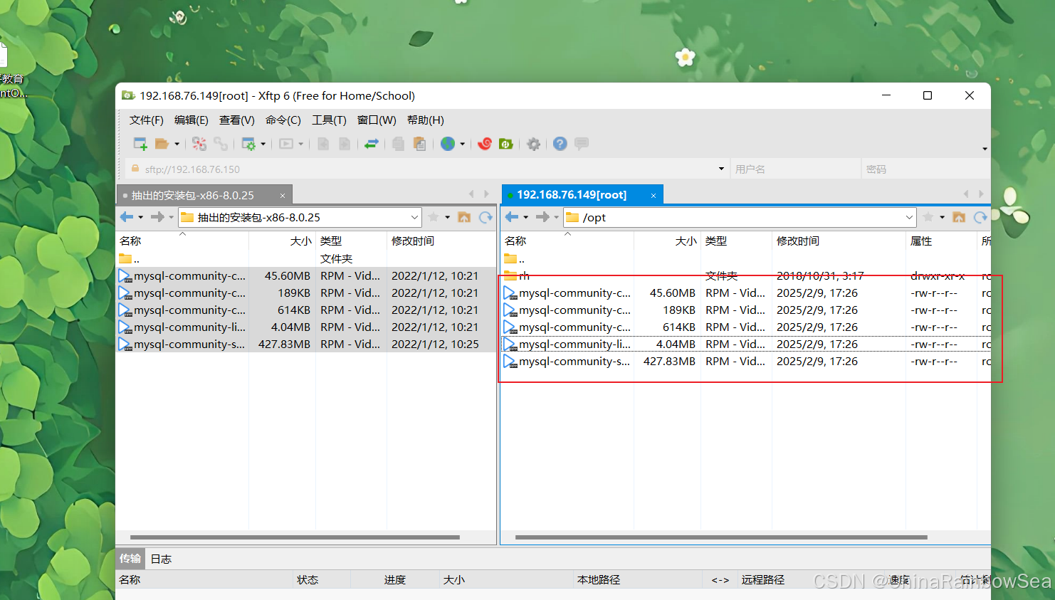 这里我们通过 XFtp 工具,将其上传到虚拟机的Linux 当中的 opt 目录当中去。