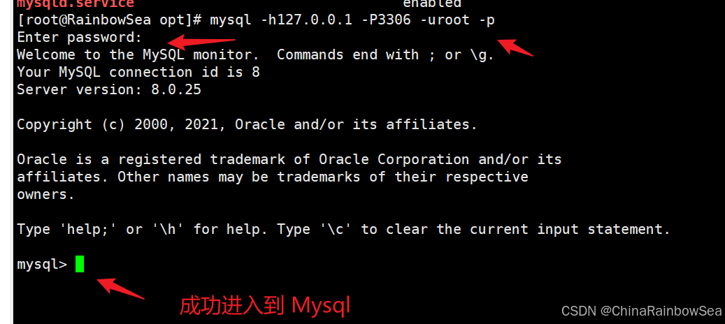 首次登录:通过 mysql -hlocalhost -P3306 -uroot -p 进行登录,在Enter password:录入初始化密码