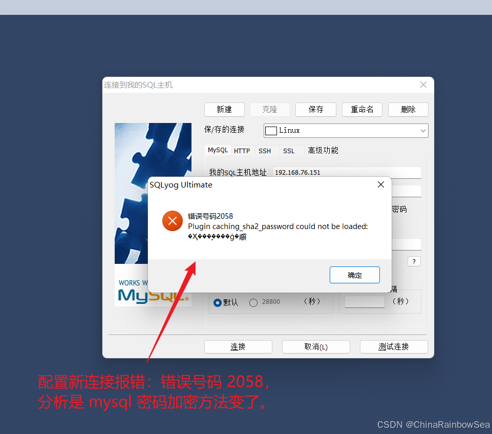 配置新连接报错:错误号码 2058,分析是 mysql 密码加密方法变了。