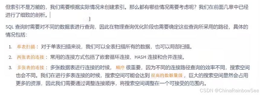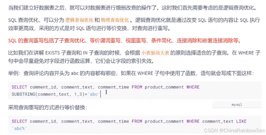 物理查询优化是在确定了逻辑查询优化之后,采用物理优化技术(比如索引等),通过计算代价模型对 各种可能的访问路径进行估算,从而找到执行方式中代价最小的作为执行计划。在这个部分中,我们需要掌握的重点是对索引的创建和使用。