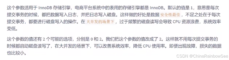 innodb_flush_log_at_trx_commit :表示 何时将缓冲区的数据写入日志文件 ,并且将日志文件 写入磁盘中。该参数对于innoDB引擎非常重要。该参数有3个值,分别为0、1和2。该参数的默认值 为1。